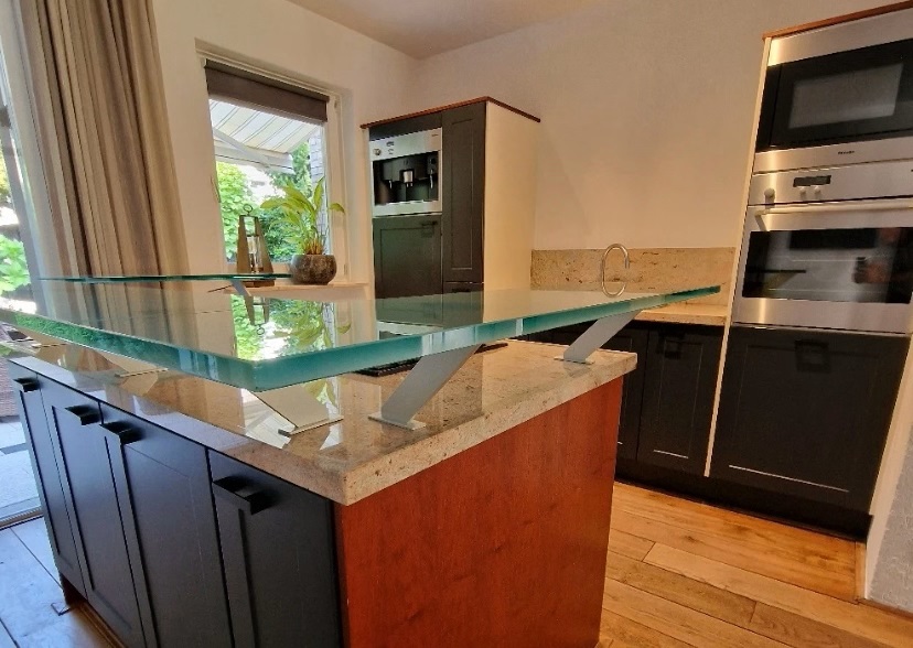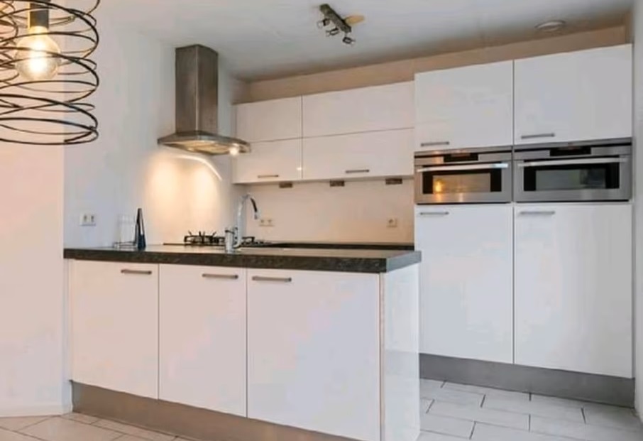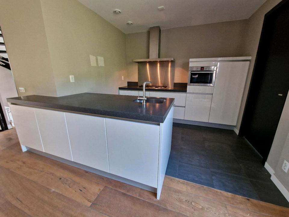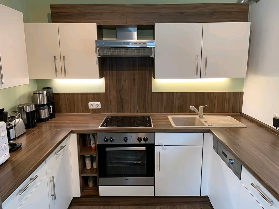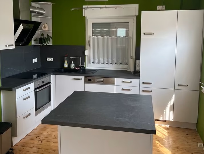 Moderní kuchyně, spotřebiče: vestavěná kompaktní kombi trouba s mikrovlnnou, plynová varná deska (na přání dodáme elektrickou), digestoř, plně integrovaná myčka, vestavěná lednice. Kompozitová pracovní deska.