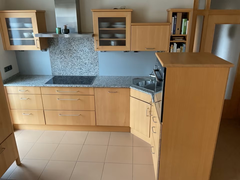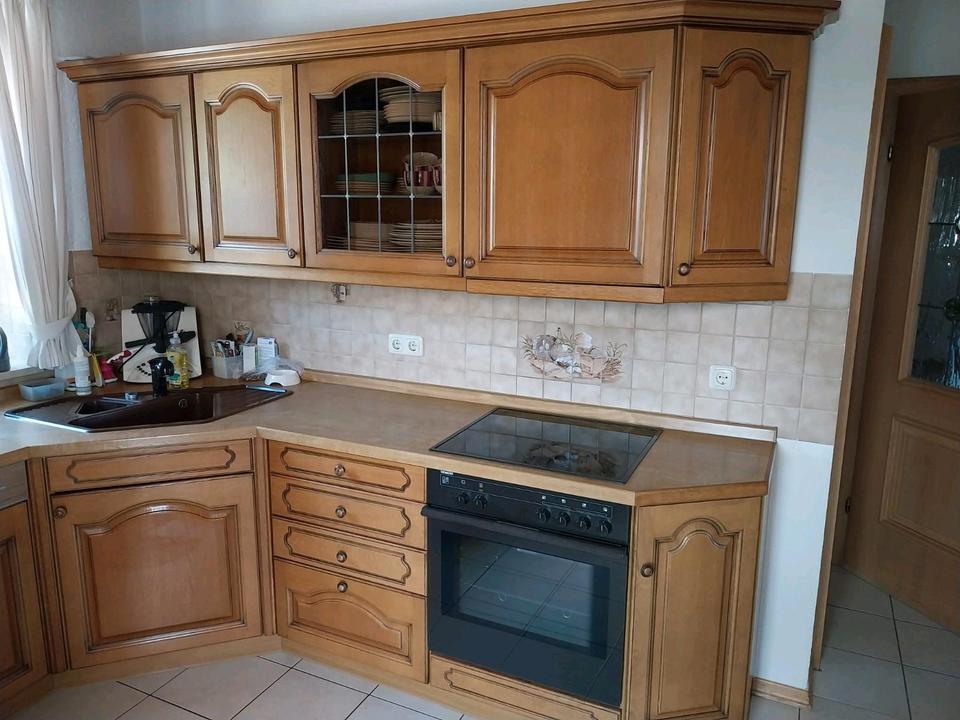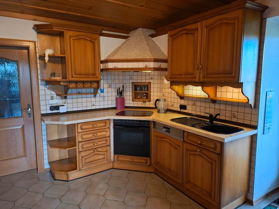 Klasická masivní kuchyně, buk, spotřebiče: vestavěná trouba, XL varná deska Siemens, digestoř, plně integrovaná myčka Bosch, vestavěná lednice. Kamenná pracovní deska.