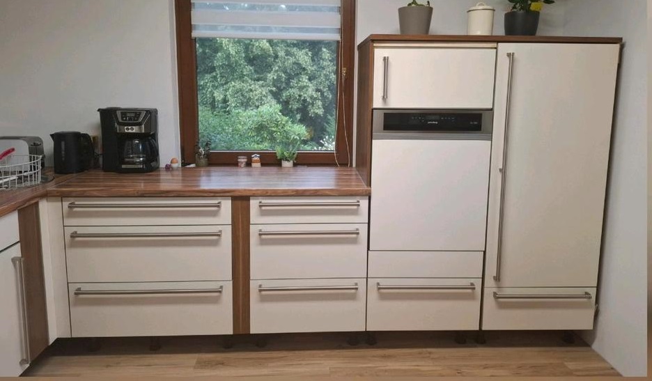 Moderní kuchyně, (vady na dvířkách). Spotřebiče Bosch: trouba + varná deska, digestoř, vestavěná mikrovlnná trouba, plně integrovaná myčka, vestavěná lednice.