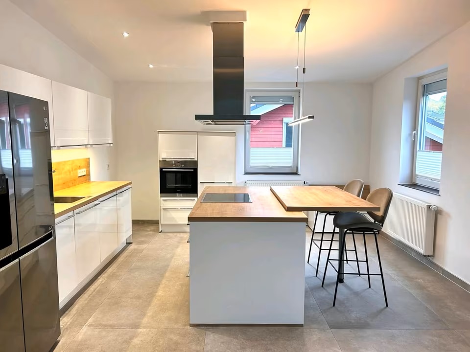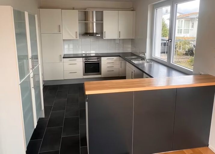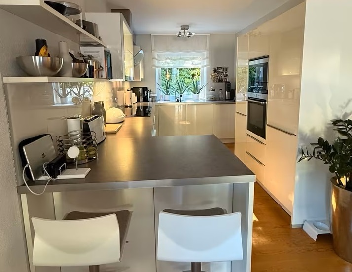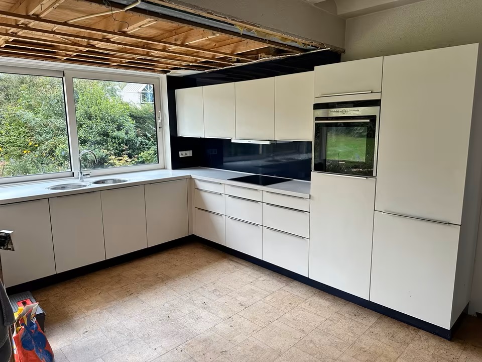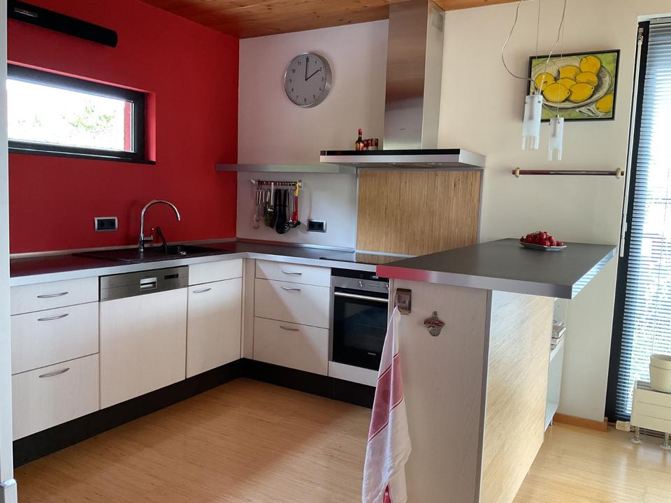 Velká moderní kuchyně, spotřebiče: vestavěná trouba Siemens, vestavěná kombi mikrovlnná trouba Siemens, XXL indukční varná deska (odštípnutý růžek, ale funguje bezvadně), digestoř, plně integrovaná myčka Bosch, vestavěná lednice, vestavěný mrazák.