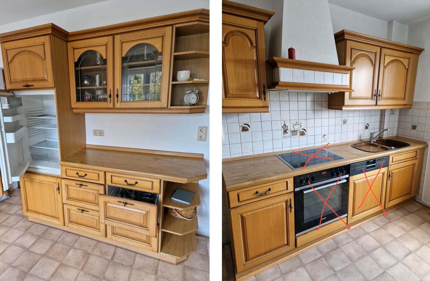 Rustikální kuchyně, dub, spotřebiče: trouba + varná deska, digestoř, vestavěná lednice. Bez zobrazené myčky, v ceně dodáme jinou myčku z našeho skladu.