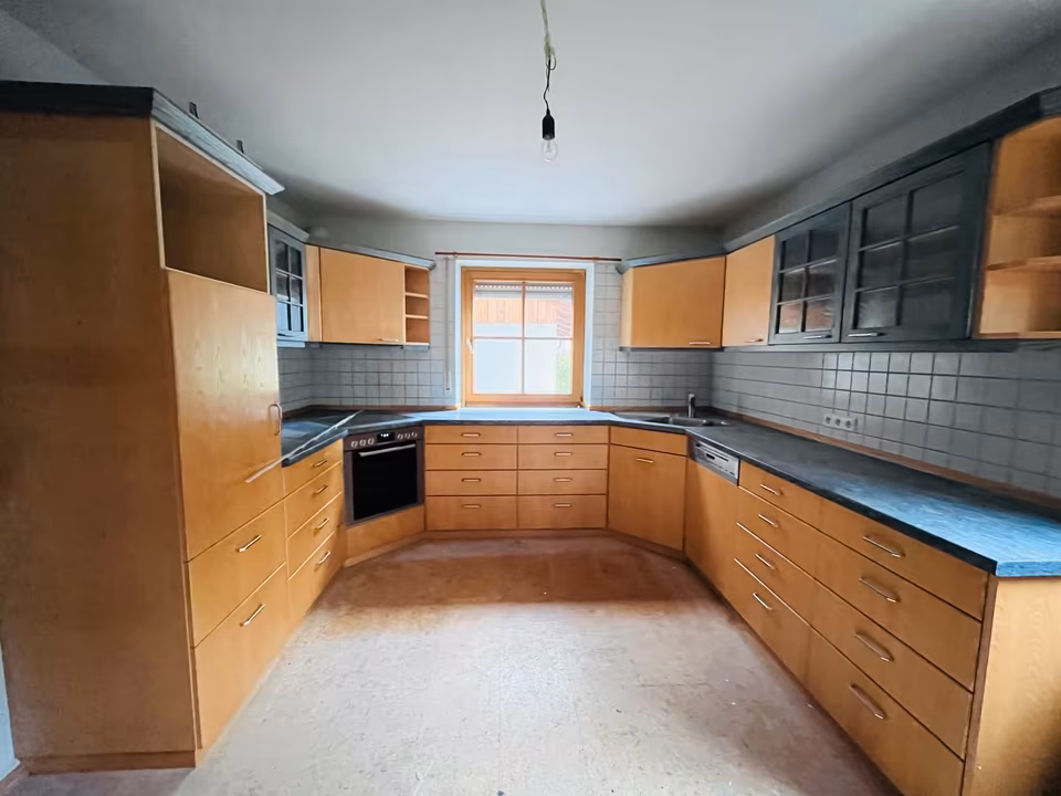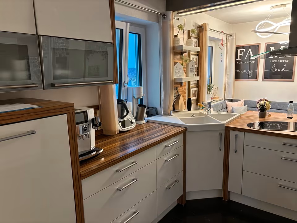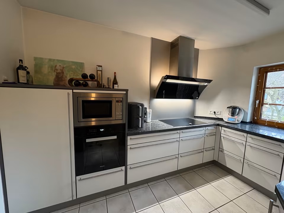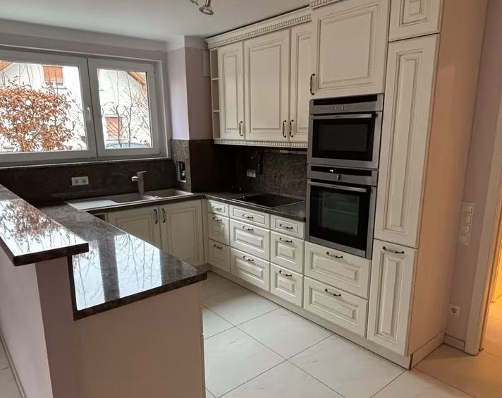 Kuchyně v moderně-venkovském stylu, spotřebiče: vestavěná kombi trouba Neff, vestavěná kombi mikrovlnná trouba Neff, indukční varná deska Neff, digestoř Neff, plně integrovaná myčka Neff, vestavěná kombi lednice s mrazákem Miele. PC kuchyně 21.000 Euro.