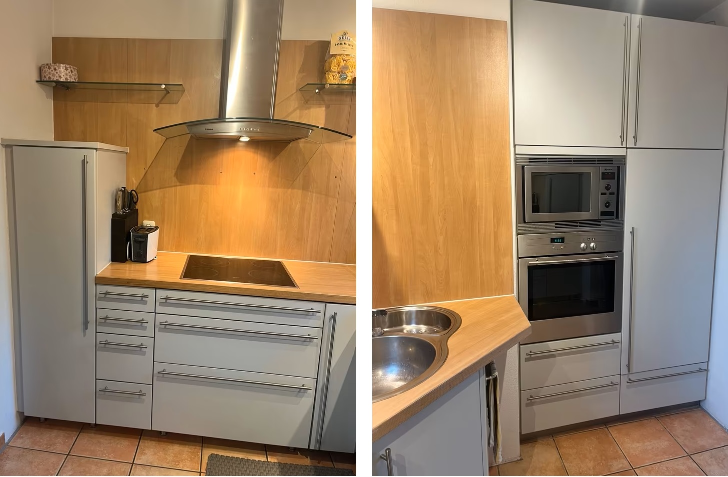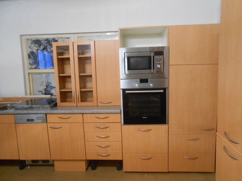 Moderní kuchyně, spotřebiče: vestavěná trouba, vestavěná mikrovlnná trouba, varná deska, digestoř. Bez zobrazené myčky, v ceně dodáme jinou myčku z našeho skladu (originální krycí dvířka k dispozici).